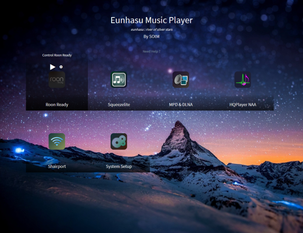 Open the web browser on a PC or smart device and connect to http://eunhasu. On Apple® devices, connect to http://eunhasu.local. You can get the Eunhasu device’s IP address or link from http://sotm-audio.com/my if you’re using Android device. It works based on an IPv4 network. If either of the above paths do not make the connection to Eunhasu Web GUI, check the router setup to find out the IP address of your device(e.g. sMS-200 or sMS-1000SQ). And then enter your device's IP address like http://xxx.xxx.xxx.xxx directly into the browser to connect to the Eunhasu Web GUI. If you still can’t access the Eunhasu Web GUI, you will need to check that your network status or power connection is okay. If you connect to Eunhasu Web GUI successfully, you will see the home screen as like the image below.