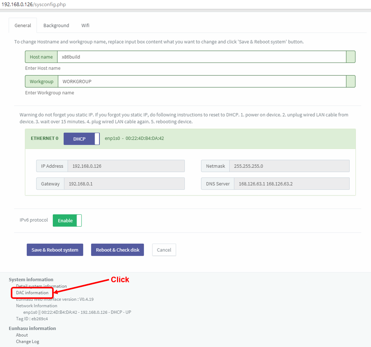 To check whether your DAC natively supports DSD playback in Eunhasu, please follow the steps below. Click the DAC information link at the bottom side of System config page.