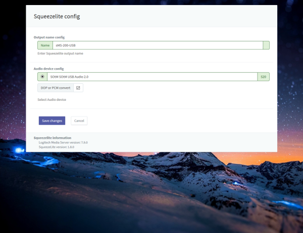 Save changes: Save the information you entered or modified, and Squeezelite and Logitech Media Server will automatically restart if Squeezelite is started and running.