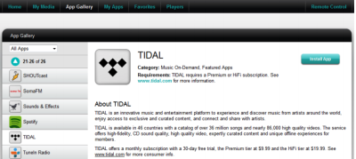 You can create an account at www.mysqueezebox.com for free. Once you have created and verified your account user name and password you can login to your account on the website and select ‘App Gallery’ and scroll down to ‘TIDAL’.