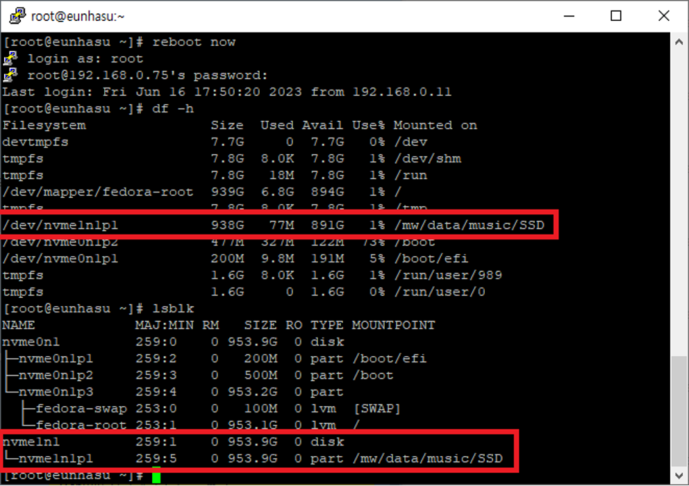 15. reboot를 해도 mount가 잘 되는지 확인합니다.