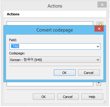 “코드페이지 변환”이라는 새로운 창이 나타나게 되며, “필드”의 드롭다운 메뉴에서, “_Tag” 를 선택하고, “코드페이지”의 드롭다운 메뉴에서 “Korean-한국어(949)“를 선택하여 “확인”을 클릭합니다.