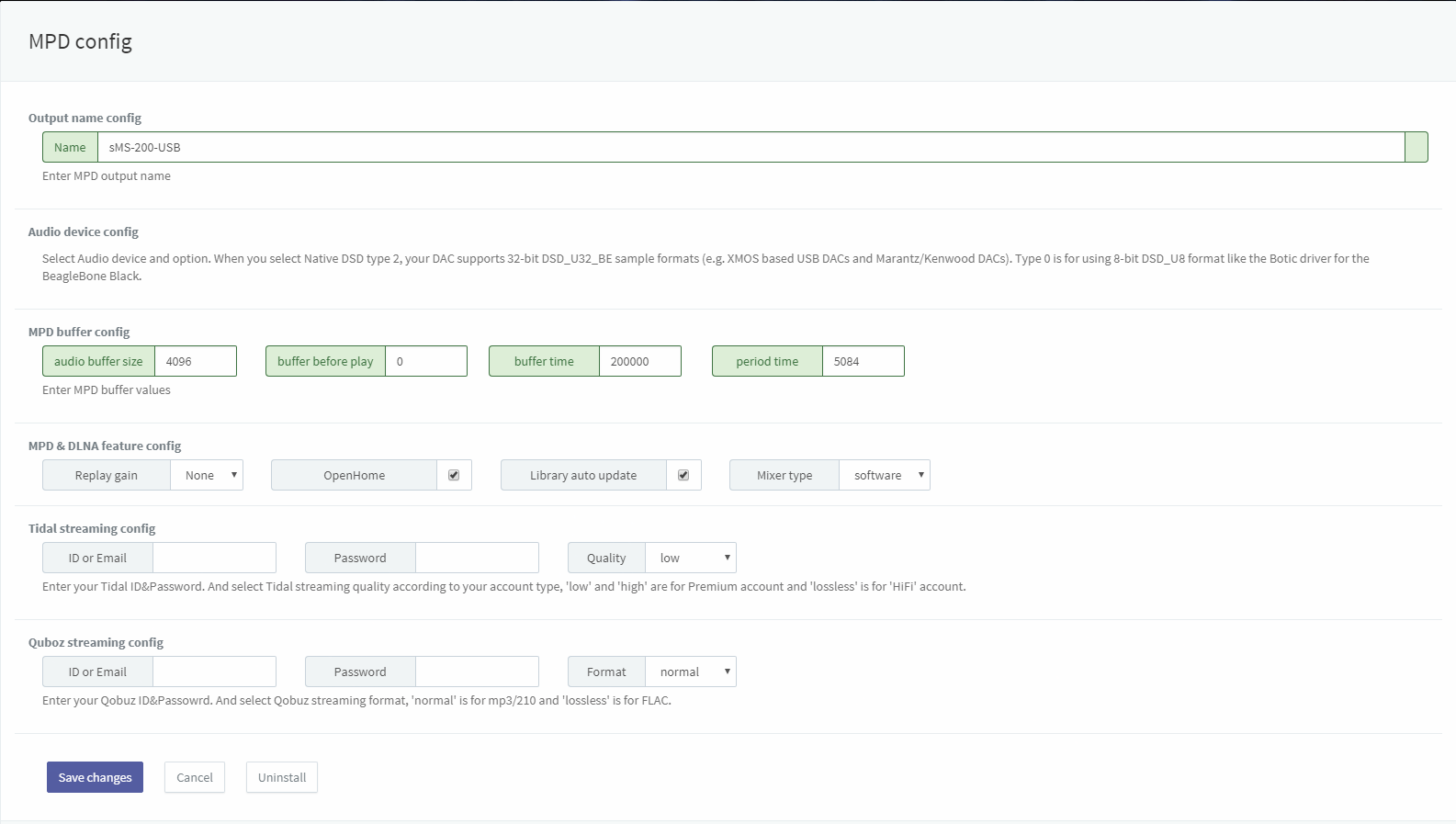 Qobuz streaming config: mpd/dlna를 이용하여 Qobuz 스트리밍을 사용하는 유저를 위한 설정 입니다. ID와 Password란에 사용하는 Qobuz 계정 정보를 입력하고, 본인이 사용하는 Qobuz 등급에 따라 Format을 설정하십시오. nomal등급은 mp3음원재생이 가능하고, lossless는 FLAC음원까지 재생 가능합니다.