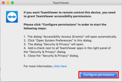 • 최초 TeamViewer를 실행하면, 권한 설정에 대한 대화상자가 나타납니다.