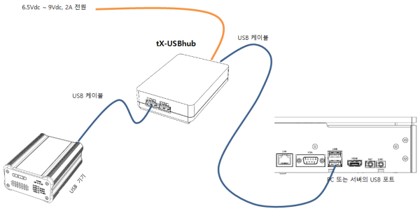 6.5Vdc ~ 9Vdc, 2A 의 동봉된 아답터 혹은 전원 장치인 mBPs-d2s 또는 sPS-1000을 전원 입력 잭에 연결하여 tX-USBhub에 전원을 공급합니다.
